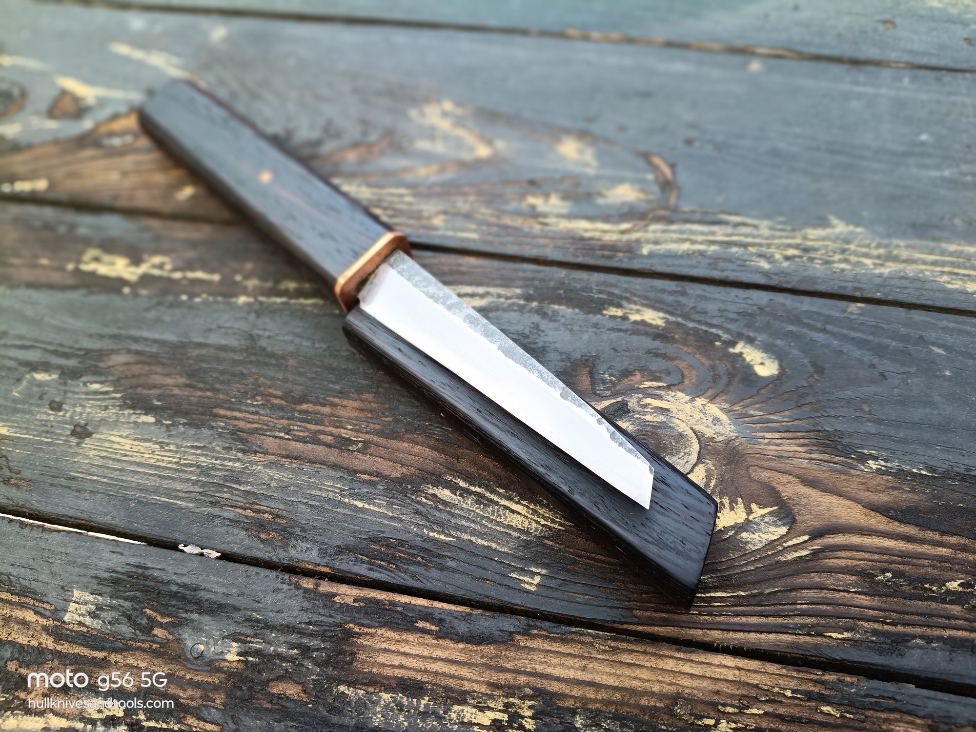 Hand forge Laminated Kiridashi 切出し小刀 Ni-Mai single bevel knife. Forge weld single bevel blade from Takefu Vtoku2 blade steel and mid steel tang. Hand polished blade with natural stones to keep nice contrast between carbon steel cutting edge (mirror finish) and mid steel body witch keep frosty silver finish.