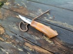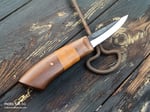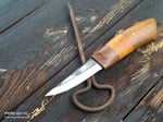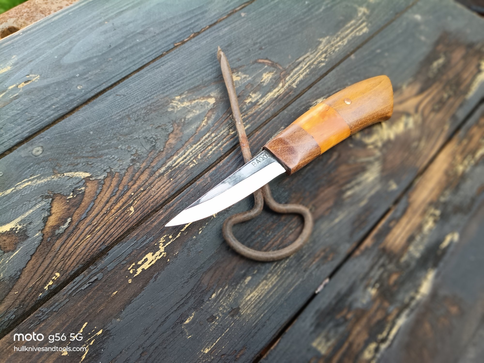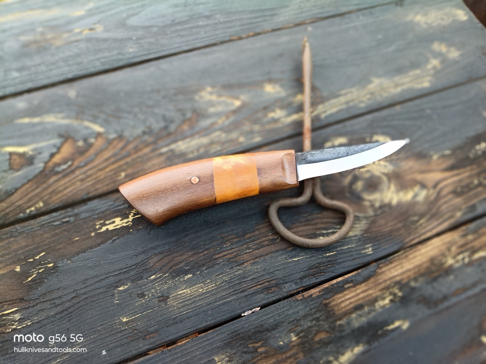Handle: English Walnut and Karelian birch, oiled and waxed, copper rivet holds blade and handle together ( no epoxy glue).