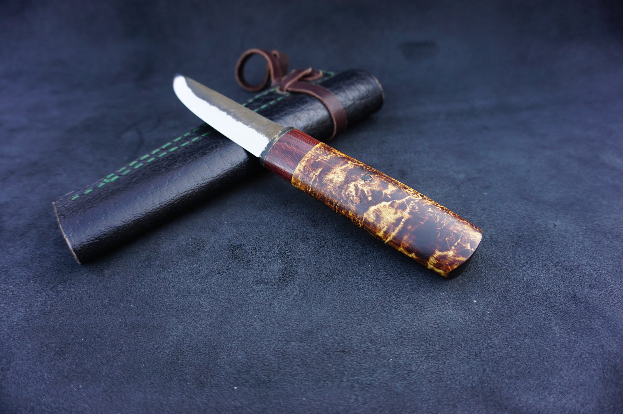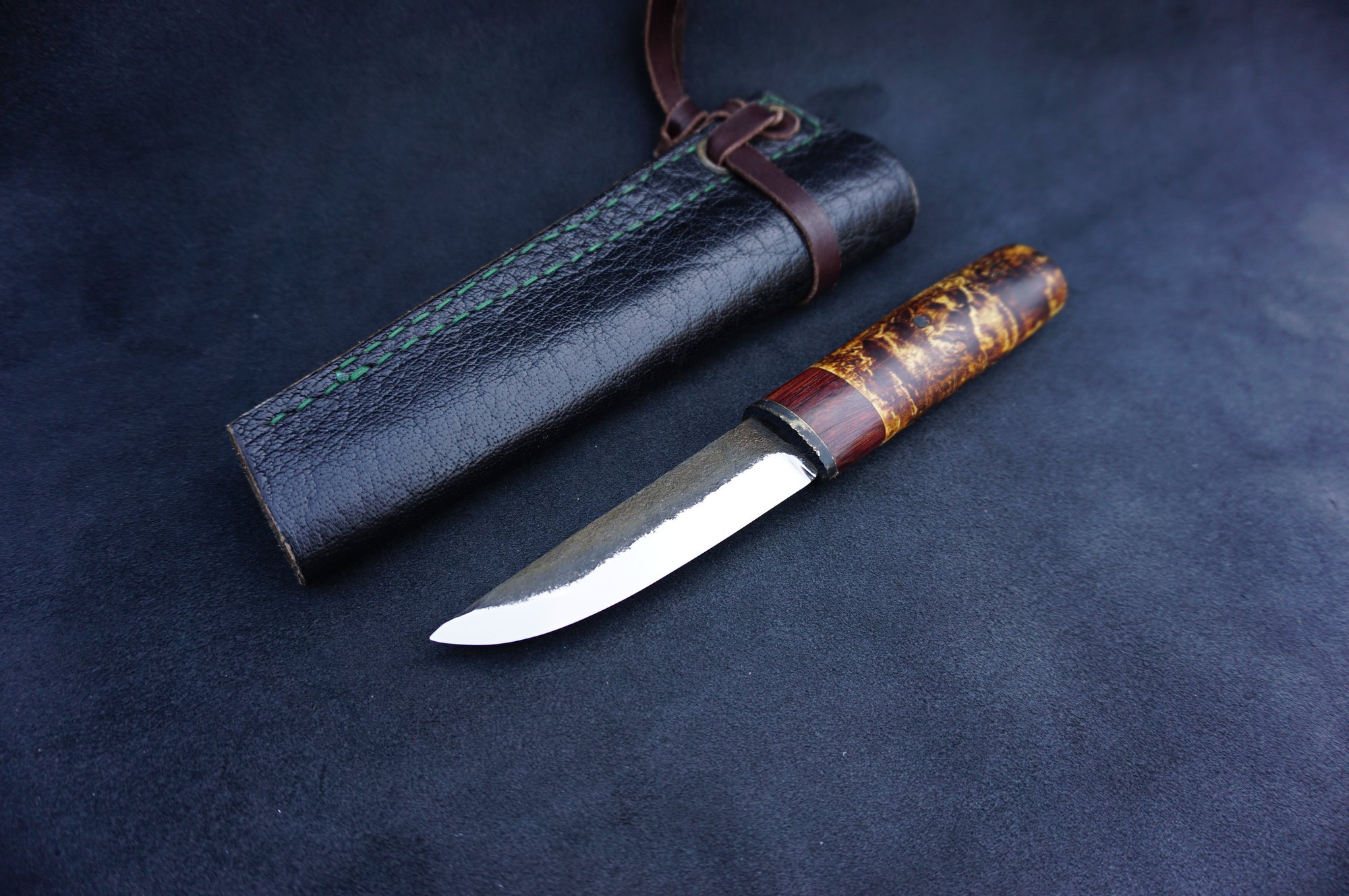 Hand forged 52100 carbon steel Yakut knife asymmetrical blade with hammered fuller on flat side of blade, chisel grind with convex edge.